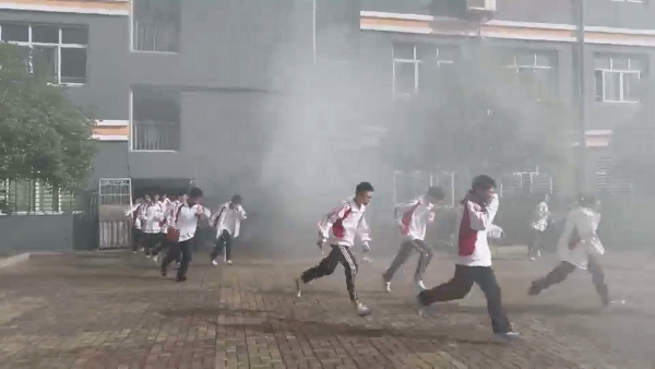 8點45分,隨著第一次警報聲響起,學生立即原地下蹲,雙手抱頭,做好應(yīng)急避震動作。第二次警報聲響后,學生在班主任指導下,低姿捂鼻穿過煙霧模擬區(qū),有序撤離教學樓,按預定疏散路線快速到達指定位置。全程無擁擠,演練活動井然有序,達到預期效果。荊門市安居消防知識宣傳中心劉果指導員對疏散演練進行了點評,肯定了我校學生的防震逃生技能,提出了更完善的建議。
