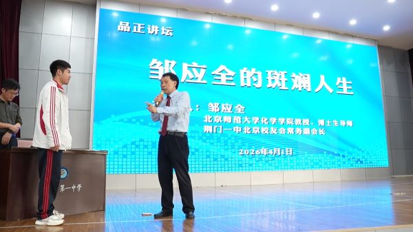 2026年4月1日,荊門一中校園暖意融融、書香四溢,“品正講壇”迎來重磅嘉賓。我校1982屆杰出校友、北京師范大學化學學院教授、博士生導師鄒應全回訪母校,為全體師生帶來一場題為“鄒應全的斑斕人生”的精彩講座。